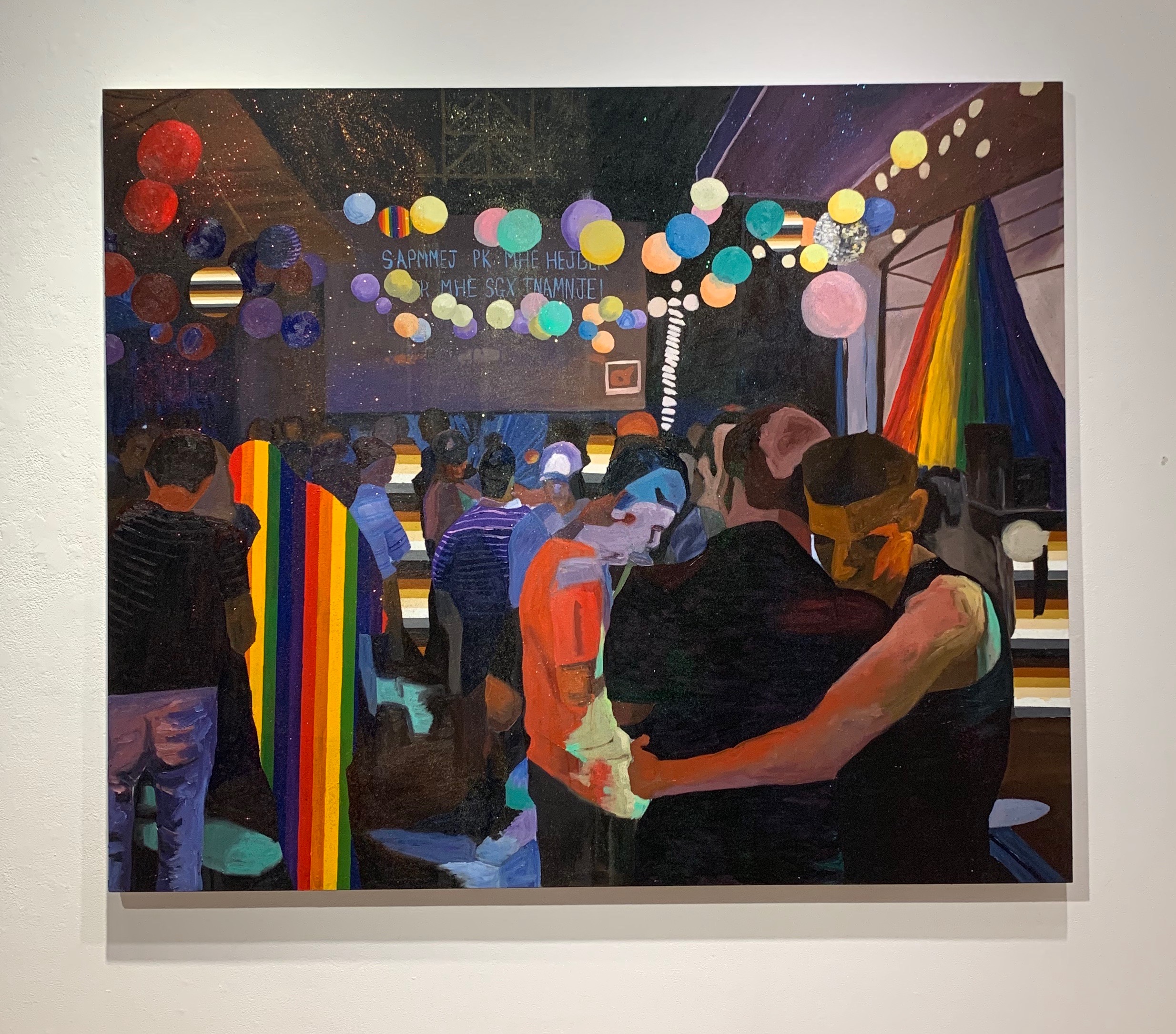 To begin with, the exhibition was made up of seven different art pieces all made by Stevan Dupus himself. During our conversation he mentioned that they were all oils on canvas as well as cold wax. Most of his paintings were very big with really vibrant colors. They all displayed people hanging out in bars or clubs with a lot of lights, glitter, and color surrounding them. Even though his paintings were big you had to come up close to take a look at the small details and messages each one of them held. There was a pattern in a couple of his paintings in which he displayed colorful striped shadows of people to represent different flags in the gay community which I found very interesting.